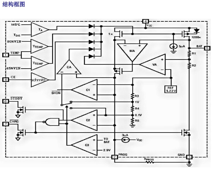 采用了内部 PMOSFET 架构,加上防倒充电路,所以 不需要外部隔离二极管。热反馈可对充电电流进行自 动调节,以便在大功率操作或高环境温度条件下对芯 片温度加以限制。充电电压固定与 4.2V,而充电电 流可通过一个电阻器进行外部设置。当充电电流在达 到最终浮充电压之后降至设定值 1/10 时,AD4056 将 自动终止充电循环。
